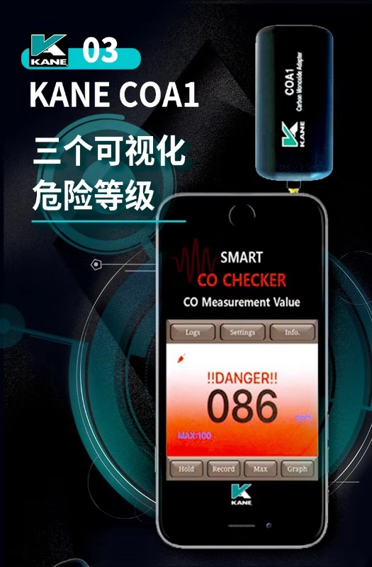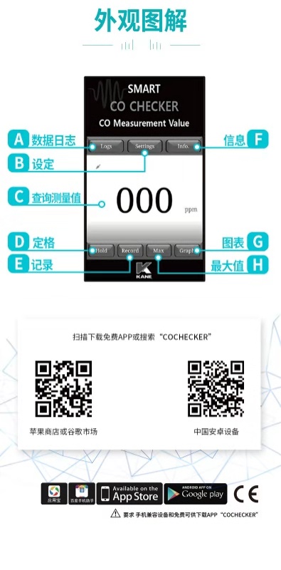 英國KANE凱恩手機銜接一氧化碳探測儀 KANE COA1 一氧化碳探測儀 手機銜接解決方案 • 可探測一氧化碳至1ppm • 一氧化碳讀取至999ppm • 與iOs或安卓系統(tǒng)兼容 • 可在免費APP上顯示3個危險等級 • APP上可以保存數(shù)據(jù)和發(fā)送郵件數(shù)據(jù) • 工作溫度:32O至104℉(0O至40℃) • 準(zhǔn)確度:±(3%+1PPM