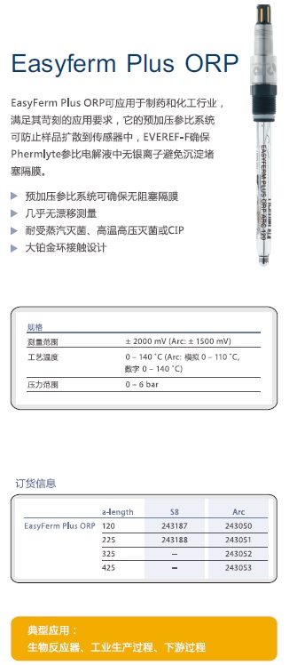 EasyFerm Plus ORP可應(yīng)用于制藥和化工行業(yè),,滿足其苛刻的應(yīng)用要求,,它的預(yù)加壓參比系統(tǒng)可防止樣品擴(kuò)散到傳感器中,,EVEREF-F確保Phermlyte參比電解液中無(wú)銀離子避免沉淀堵塞隔膜。