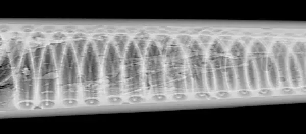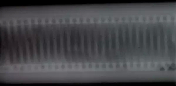可見利用X射線照相檢測方法對該型號空速管進(jìn)行檢測不可能實(shí)現(xiàn)對整圈加熱絲一周焊接狀況的檢測因?yàn)槊恳淮瓮刚罩荒軝z測每圈加熱絲與射線束相切部位的這極少的部分。如果要利用X射線照相檢測方法對加熱絲整圈焊接狀況進(jìn)行檢測那么將對技術(shù)和生產(chǎn)效率帶來極大的挑戰(zhàn)。