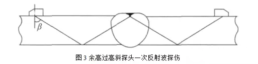 焊縫余高過高時會出現(xiàn)頂部盲區(qū)。采用斜探頭一次波進行焊縫單面探傷時(圖2)克服頂部盲區(qū)的方法是采用小前沿、大K值的探頭。采用斜探頭一次反射波進行焊縫單面探傷時(圖3)克服頂部盲區(qū)的辦法是減小探頭角度。