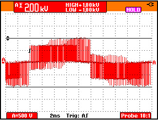 50 Hz馬達(dá)驅(qū)動(dòng)輸出電壓的脈寬調(diào)制信號(hào)的細(xì)節(jié)。1000V,50 微秒的脈沖即導(dǎo)致某些測試設(shè)備的不穩(wěn)定。