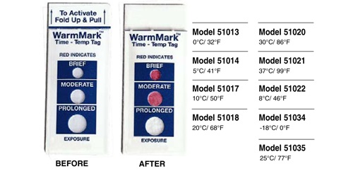 WarmMark 溫度標簽,,型號51013-51035,, 監(jiān)控產(chǎn)品在運輸、 儲存或處理過程中的溫度。反應溫度范圍可從-18℃至37℃。這些不干膠標簽直接適用于產(chǎn)品、包裝、紙箱或大包裝上。一旦反應溫度達到或超過,,標簽便被激 活而發(fā)生不可逆變色。紅色顯示溫度的閾值外暴露經(jīng)過了一個短暫,,中等或長久的時間段。你一眼便能看出是否有溫度閾值外暴露發(fā)生,,提供質(zhì)量保證的永久記錄。