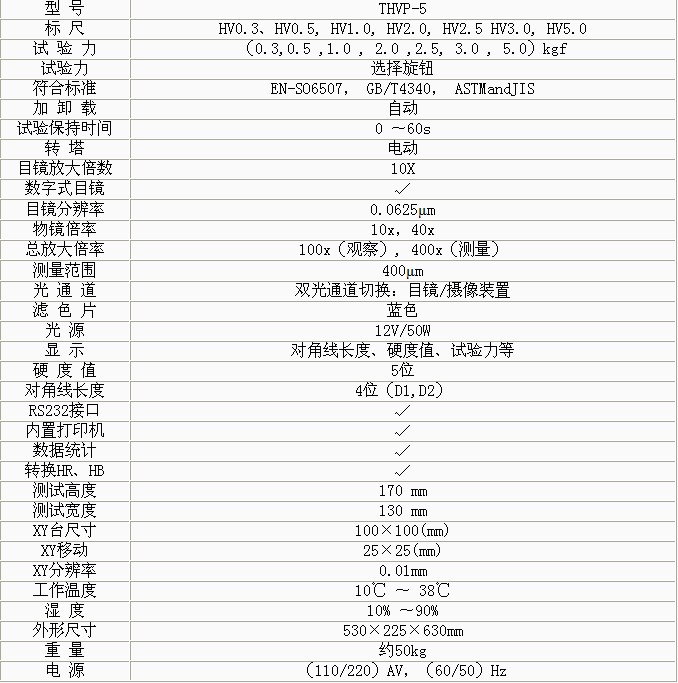 • THVP-5大屏數(shù)顯手動轉(zhuǎn)塔維氏硬度計是光機電一體化的高新技術(shù)產(chǎn)品,顯示屏使用大的LCD屏幕,維氏硬度計讀數(shù),它造型新穎、美觀,具有良好的直觀性、可操作性和可靠性,深圳尚材維氏硬度計,是測試維氏硬度的理想產(chǎn)品。該機的壓頭和物鏡之間的轉(zhuǎn)換采用自動切換裝置. • 適用于測量微小、薄形試件、表面滲鍍處理后的零件和對瑪瑙、玻璃、陶瓷等脆性材料的顯微和努氏硬度的測定 以及涂層、表面覆層、層壓金屬、熱處理碳化層和淬火硬化層的深度與硬度梯度的測定。是科研機構(gòu)、工廠及質(zhì)檢部門進行研究和檢測的理想的硬度測試儀器。 功能特點: • 硬度計在機械上采用精密的結(jié)構(gòu)設(shè)計,在光學上采用高倍率物鏡和數(shù)顯式測微目鏡,維氏硬度計日常點檢表,測量光源采用冷光源等先進技術(shù)。 • 采用閉環(huán)式加載控制系統(tǒng),全自動維氏硬度計,使試驗力精度提高,維氏硬度計檢定規(guī)程,示值的重復(fù)性及穩(wěn)定性佳。該系統(tǒng)用在維氏硬度計上,維氏硬度計 北京時代,在國內(nèi)屬首創(chuàng)。 • 操作由面板上的觸摸鍵輸入,維氏硬度計誤差,能預(yù)置試驗力保荷時間、調(diào)節(jié)測量光源的強弱、選擇維氏或努氏測試模式、硬度轉(zhuǎn)換標尺、文件號與儲存等。并能在屏幕上 顯示測量壓痕長度、硬度值、測量次數(shù)和年、月、日及時間等,維氏硬度計說明書,試驗結(jié)果和數(shù)據(jù)處理,維氏硬度計算,并通過打印機輸出,維氏硬度計標準,還能通過RS232接口與計算機連接。 • 本硬度計還可根據(jù)用戶特殊需求配置CCD裝置進行視頻測量和自動測量。 技術(shù)參數(shù):