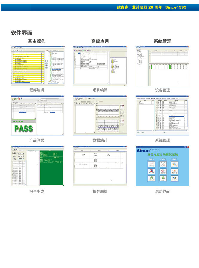 ATS系統(tǒng)軟件 AN8060自動(dòng)測(cè)試系統(tǒng)軟件包括功能強(qiáng)大的報(bào)表編輯能力、數(shù)據(jù)統(tǒng)計(jì)分析能力、多種多樣的文檔生成及系統(tǒng)用戶管理功能。軟件內(nèi)置報(bào)表模塊支持目前主流的文檔格式,,包括文本型、文檔型、報(bào)表型;同時(shí)允許用戶添加編輯多種類型的數(shù)據(jù),,如表格數(shù)據(jù)、波形數(shù)據(jù)、Microsoft Word對(duì)象等等。數(shù)據(jù)統(tǒng)計(jì)模塊提供專業(yè)的數(shù)據(jù)分析工具,用戶編輯的測(cè)試程序中的所有測(cè)試條件、結(jié)果均可以在該模塊調(diào)用專業(yè)的函數(shù)分析處理,處理結(jié)果可以保存為Microsoft Excel文件也可以打印。