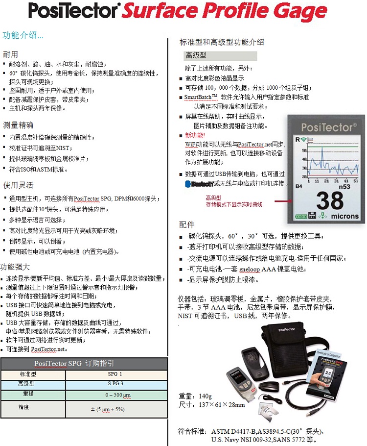 美國(guó) DeFelsko公司新推出的PosiTector SPG表面粗糙度測(cè)量?jī)x,測(cè)量準(zhǔn)確,粗糙度儀檢定規(guī)程,菜單方便。分為SPG1 數(shù)顯表面粗糙度儀標(biāo)準(zhǔn)型和SPG3 數(shù)顯表面粗糙度儀高級(jí)型。兩種型號(hào)都帶統(tǒng)計(jì)功能,便攜式粗糙度儀,隨著測(cè)量的進(jìn)行會(huì)顯示統(tǒng)計(jì)值,青島粗糙度儀價(jià)格,進(jìn)行滾動(dòng)統(tǒng)計(jì)。此功能為大面積區(qū)域的評(píng)估節(jié)省了時(shí)間,快速建立通觀的、平均 的粗糙度數(shù)值。