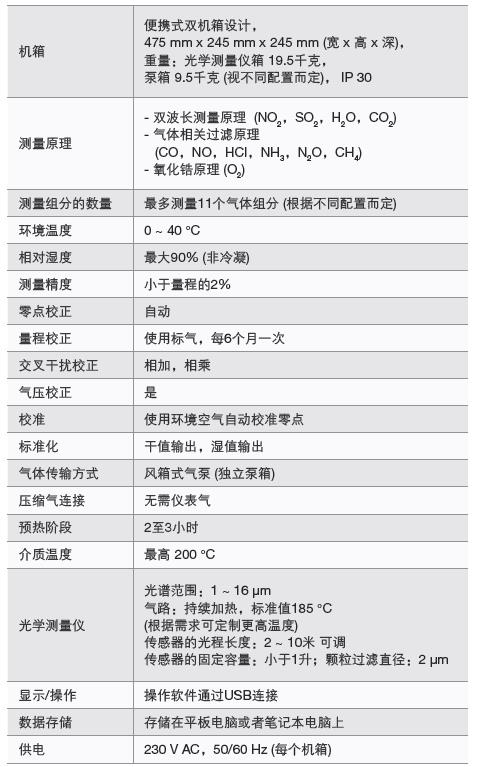 特點(diǎn) • 更長(zhǎng)的測(cè)量光程(是非分散紅外分析儀的7倍),經(jīng)濟(jì)型煙氣分析儀,更準(zhǔn)確的測(cè)量值 • 整個(gè)氣路沒有去除水分,測(cè)量組分沒有任何損失 • 小體積的移動(dòng)型紅外煙氣分析儀系統(tǒng)(不含冷凝器) • 多達(dá) 11 個(gè)氣體組分的連續(xù)型、抽取式測(cè)量 • 無(wú)需儀表氣 • 各組分經(jīng)現(xiàn)場(chǎng)測(cè)試驗(yàn)證、 現(xiàn)代光學(xué)測(cè)量科技 • 內(nèi)置采樣泵抽取 • 超長(zhǎng)運(yùn)行時(shí)間、高可靠性 • 直接在采樣點(diǎn)便捷的放置 • 經(jīng)預(yù)先校準(zhǔn) → 可立即使用 • 集成環(huán)境空氣的零氣供應(yīng) • 通過隨機(jī)軟件可視化和操作