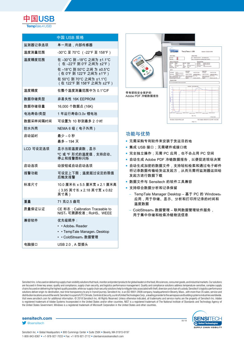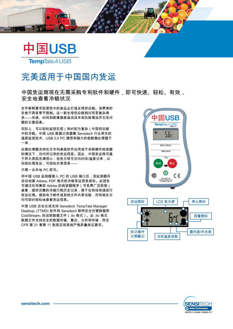 將中國 USB 監(jiān)測器插入 PC 的 USB 端口后,溫度記錄儀驅(qū)動(dòng),該監(jiān)測器將自動(dòng)創(chuàng)建 Adobe®PDF 格式的冷鏈貨運(yùn)信息報(bào)告。此報(bào)告可通過任何兼容 Adobe 的閱讀器程序(可免費(fèi)廣泛獲。┎榭,提供完整的冷鏈行程歷史記錄,便于在現(xiàn)場快速進(jìn)行貨運(yùn)處理。借助電子郵件或其他文件共享功能,所有相關(guān)方均可即時(shí)輕松地查看貨運(yùn)信息。